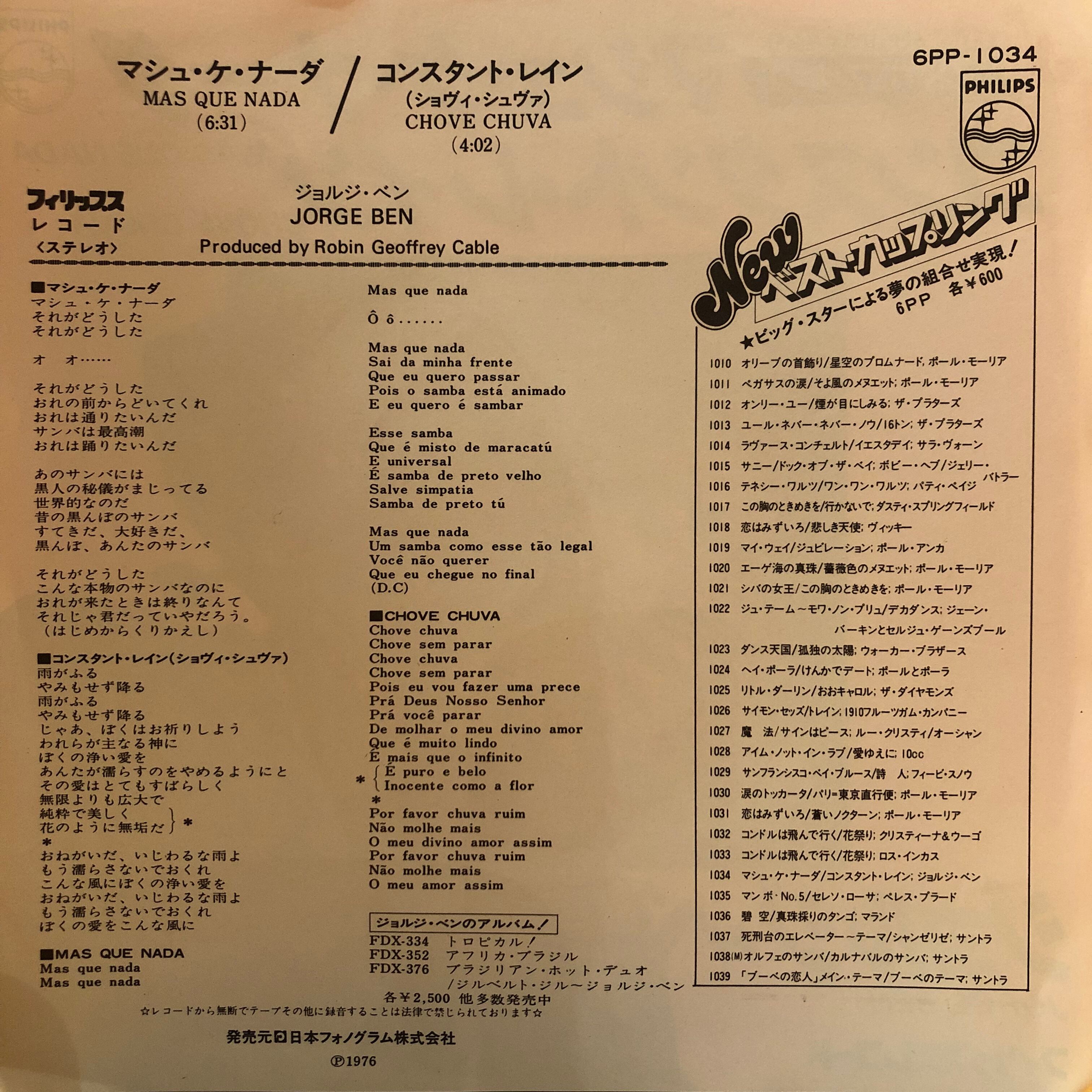 ブラジルのレジェンドSSWジョルジ・ベン’76年アルバム「Tropical」収録曲の日本独自カップリング’80年シングル。