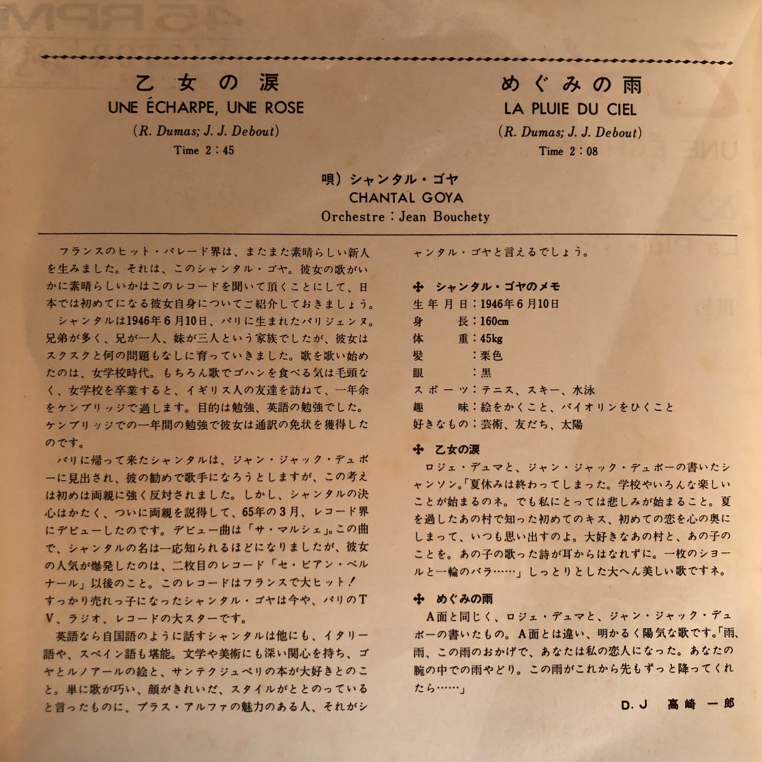 ゴダール映画への出演で知られるフランス人女優でシンガー、シャンタル・ゴヤ’65年日本独自シングル。