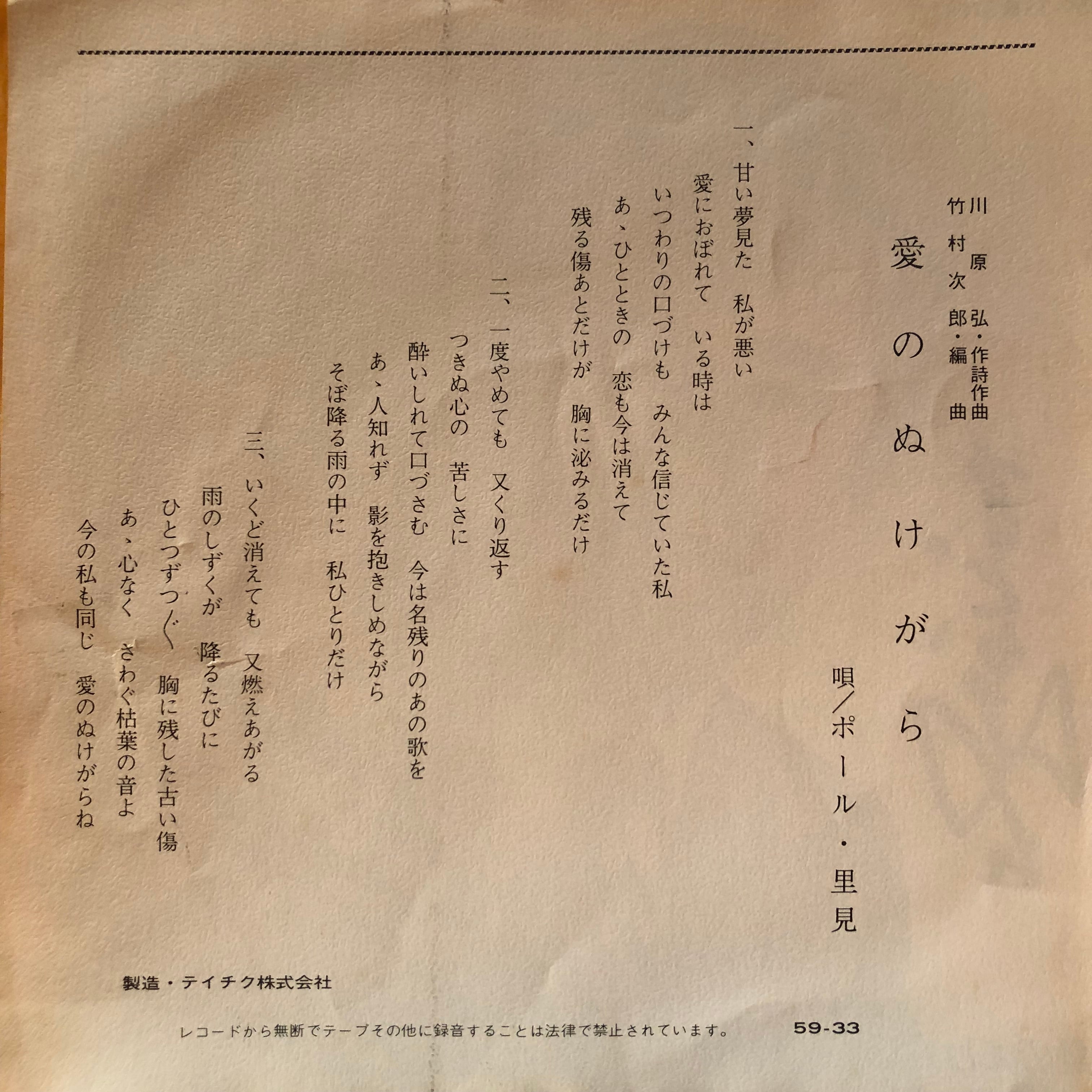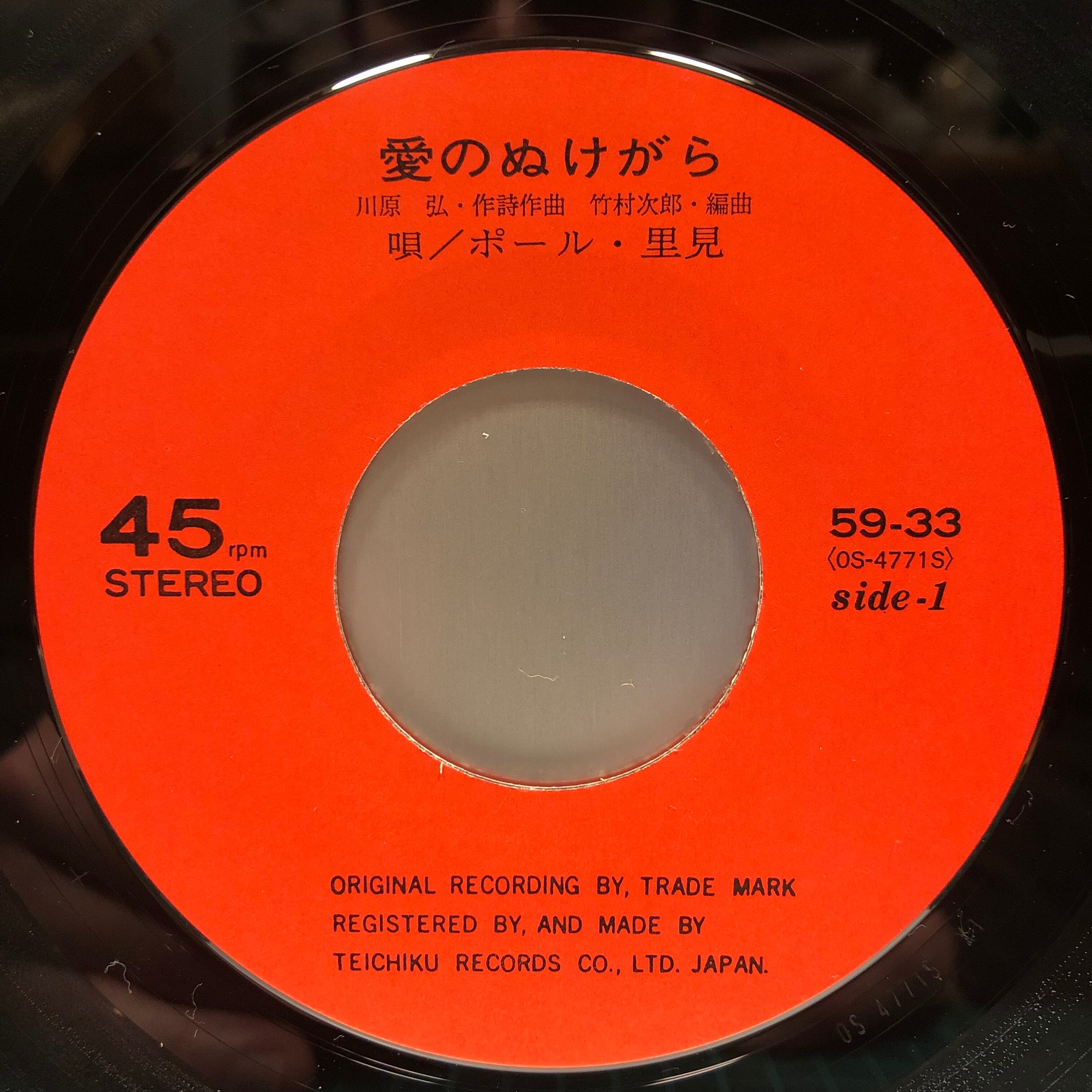 フランク永井を彷彿させる甘く豊かな低音を聴かせるムード歌手、ポール・里見自主制作シングル。