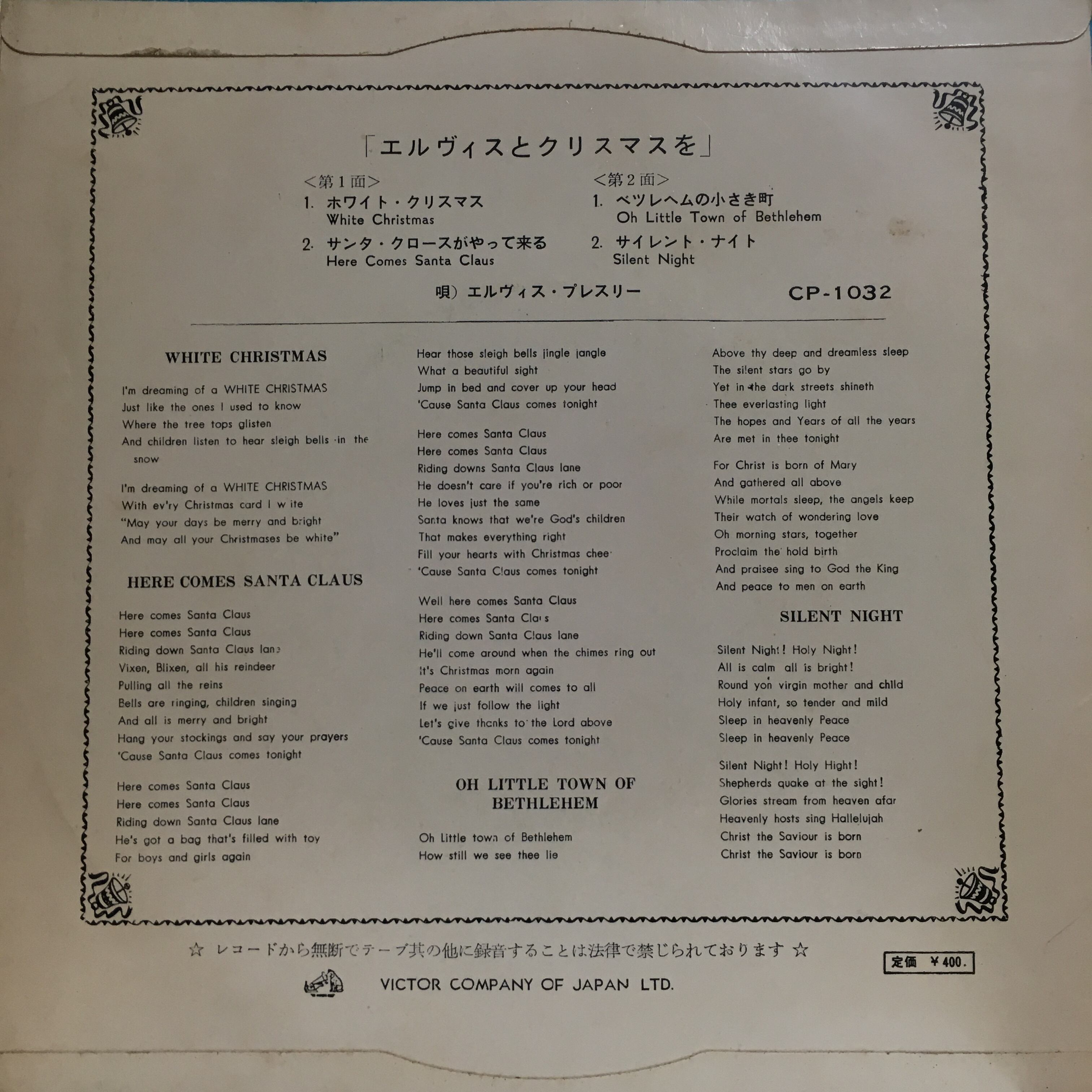 キングオブロックンロール、エルヴィス ・プレスリー’57年発表アルバム「Elvis' Christmas Album」から4曲を抜粋したコンパクト盤。