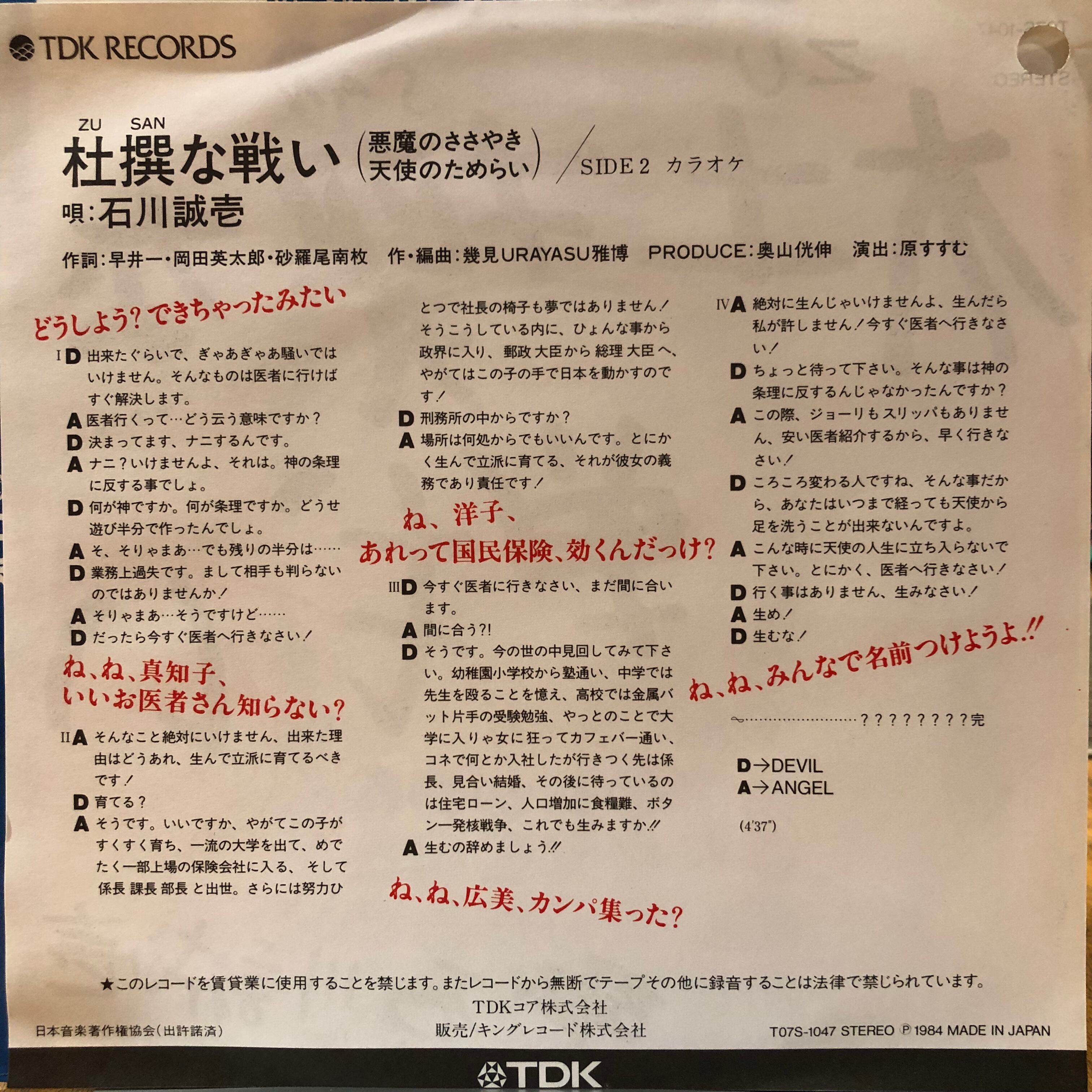 望まない妊娠をしてしまった女性の心の中で天使と悪魔がラップバトルを繰り広げる、’84年エレクトロディスコ歌謡曲。
