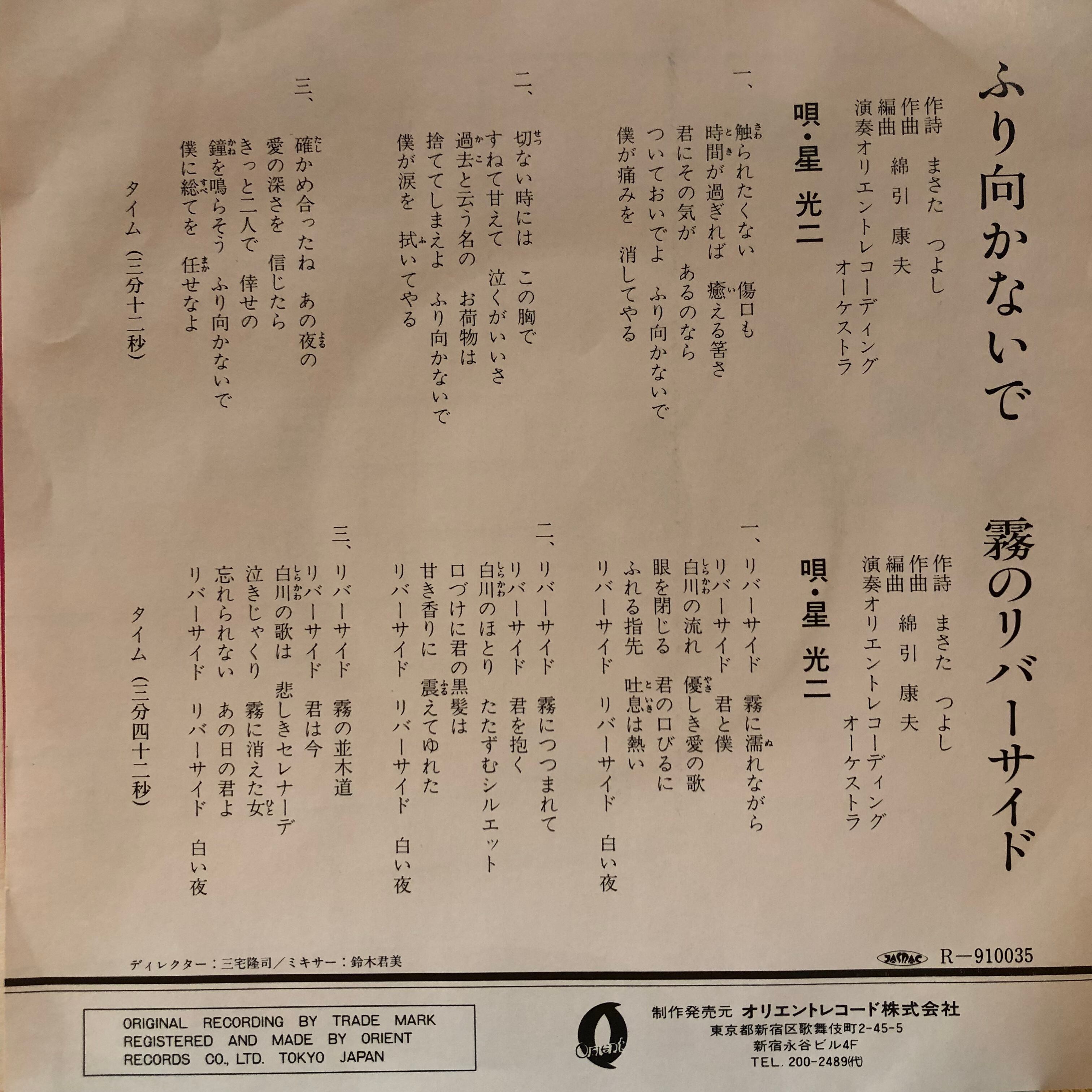 現在は野上こうじの芸名で活躍する星光ニが歌舞伎町のインディレコード会社オリエントレコードから’83年にリリースした自主制作デビューシングル。