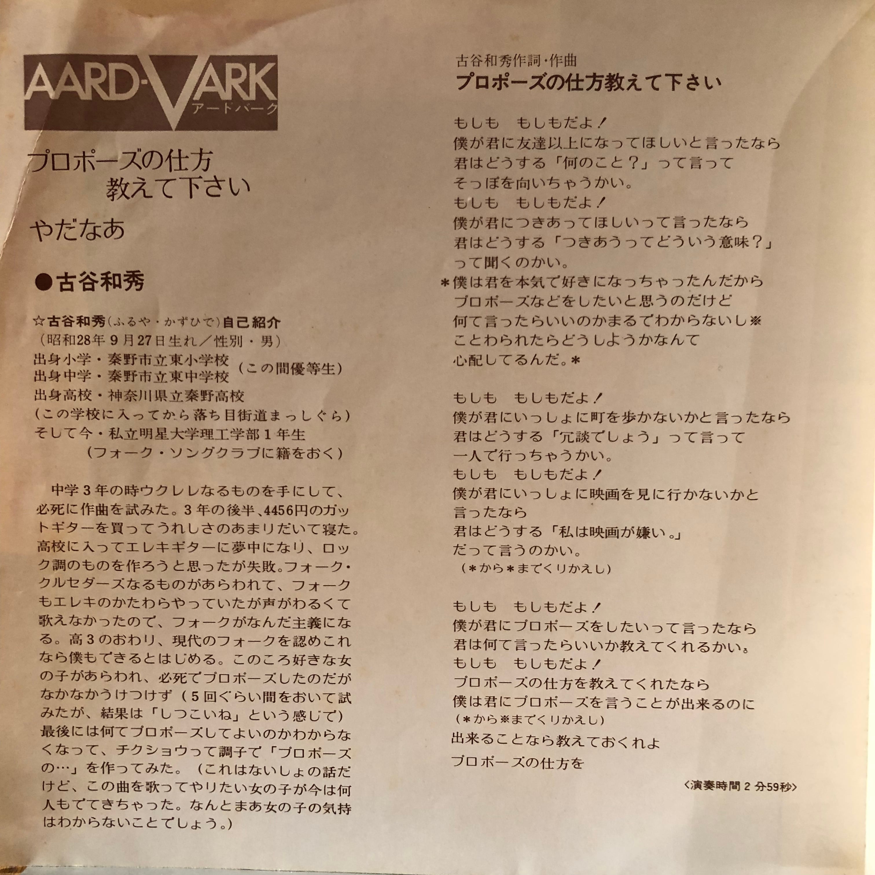 秦野市出身のポプコン系シンガーソングライター、古谷和秀'72年シングル。