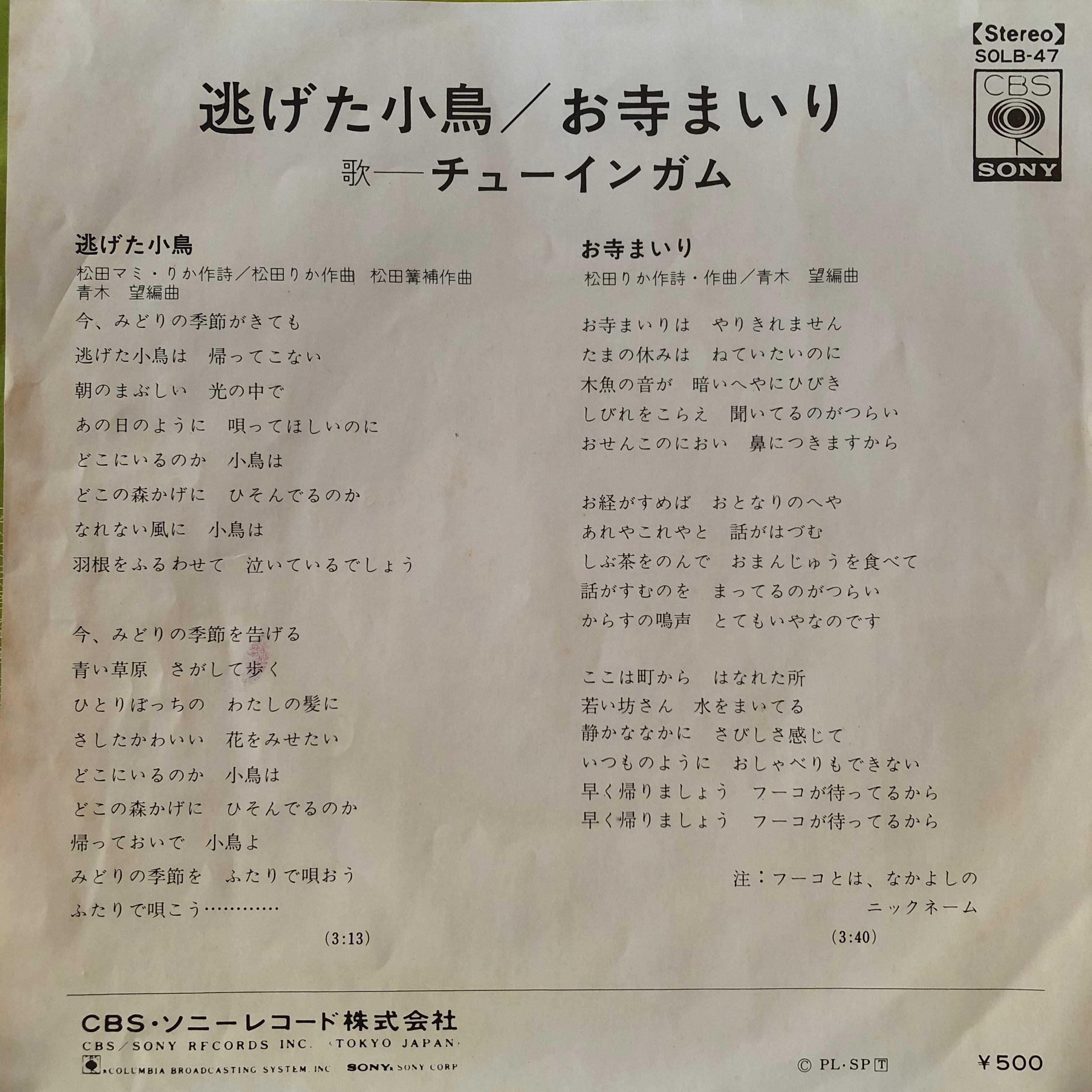 松田マミ、りかの姉妹フォークデュオ、チューインガム’73年4thシングル。
