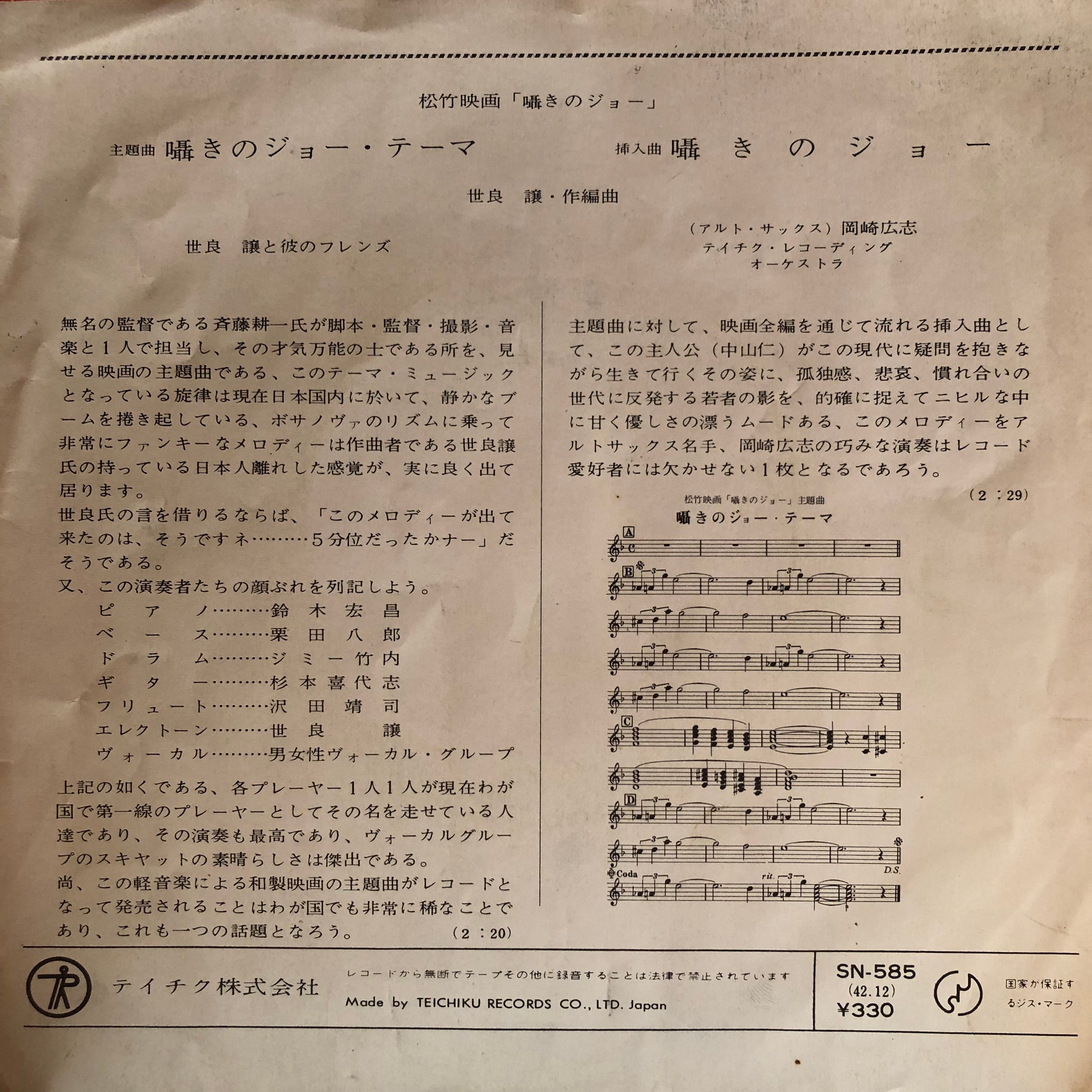 世良譲が音楽を手がけた斉藤耕一監督による’67年映画「囁きのジョー」OST。