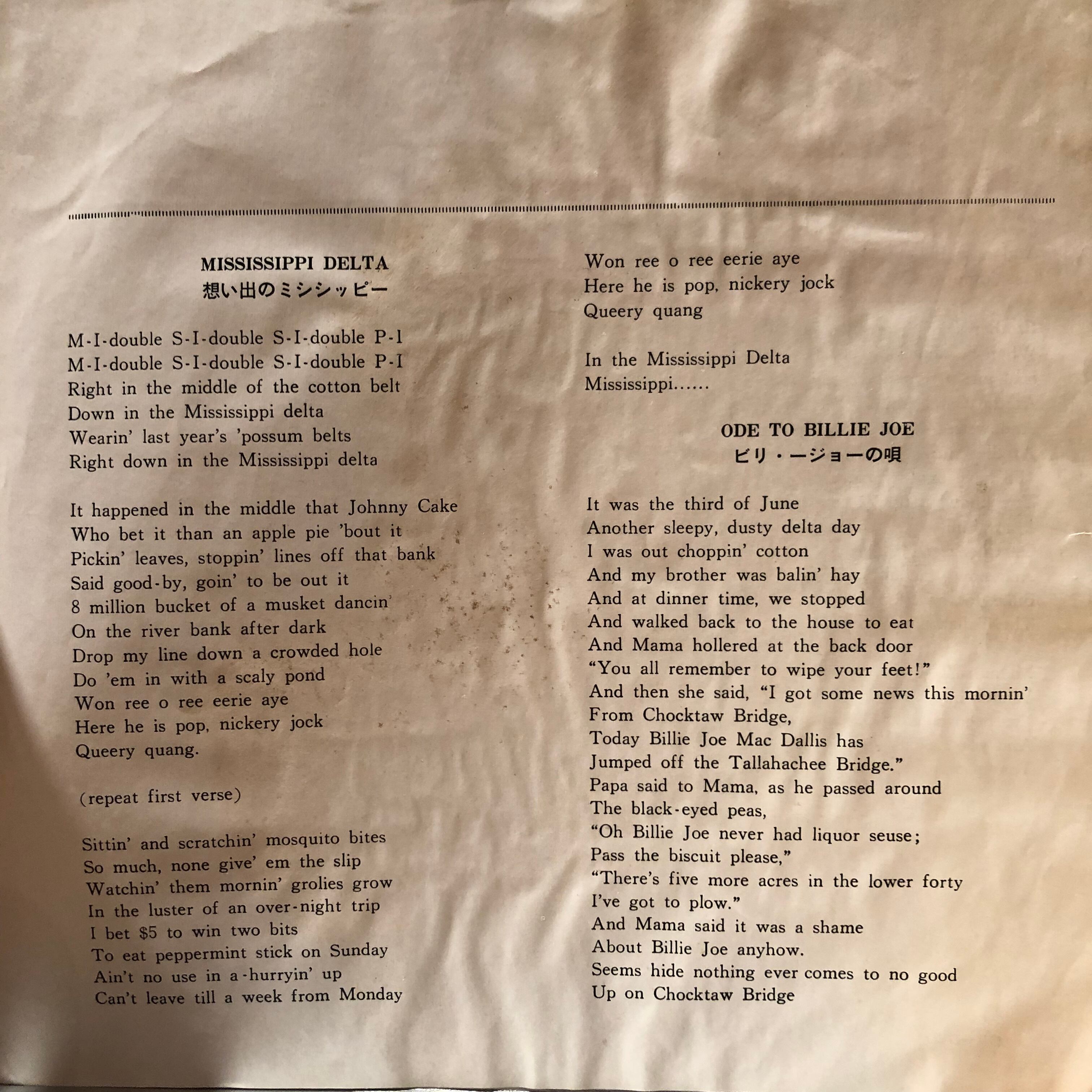 サイケデリックでスワンピー、ボビーのハスキーヴォイス映える"Mississippi Delta'、不穏な弦の響きに引き込まれるミステリアスカントリーブルース"Ode To Billie Joe"、両面素晴らしい!