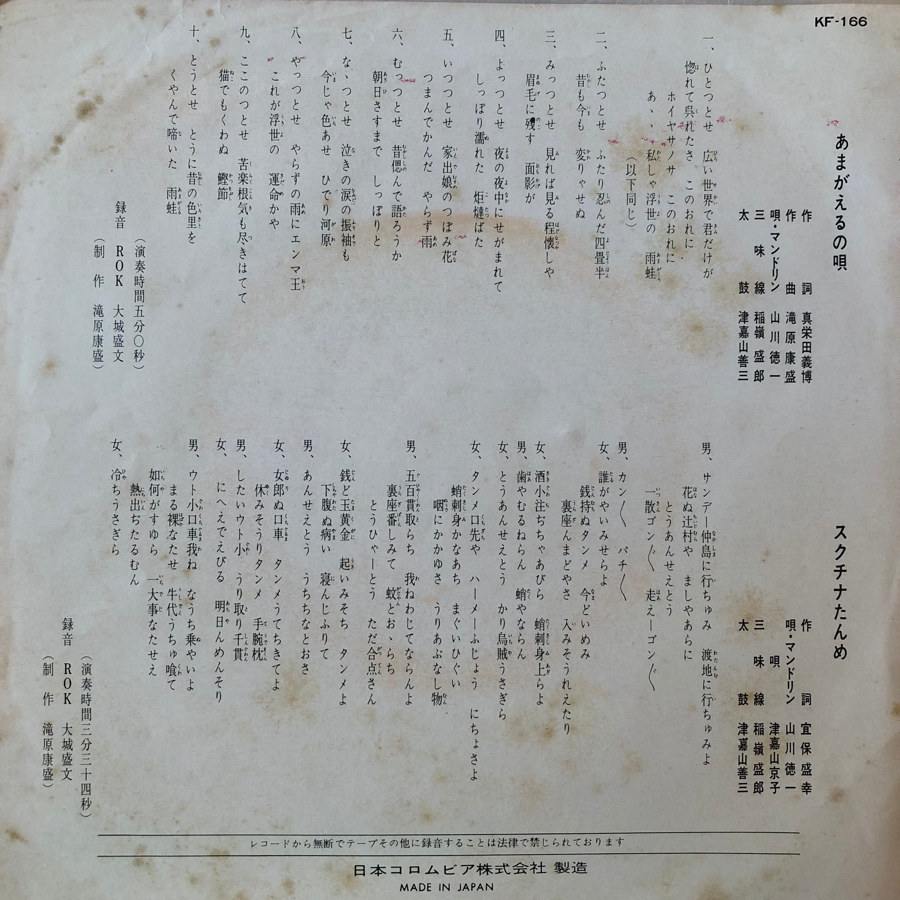沖縄民謡歌手でマンドリン奏者山川徳一、マルフクからのシングル。