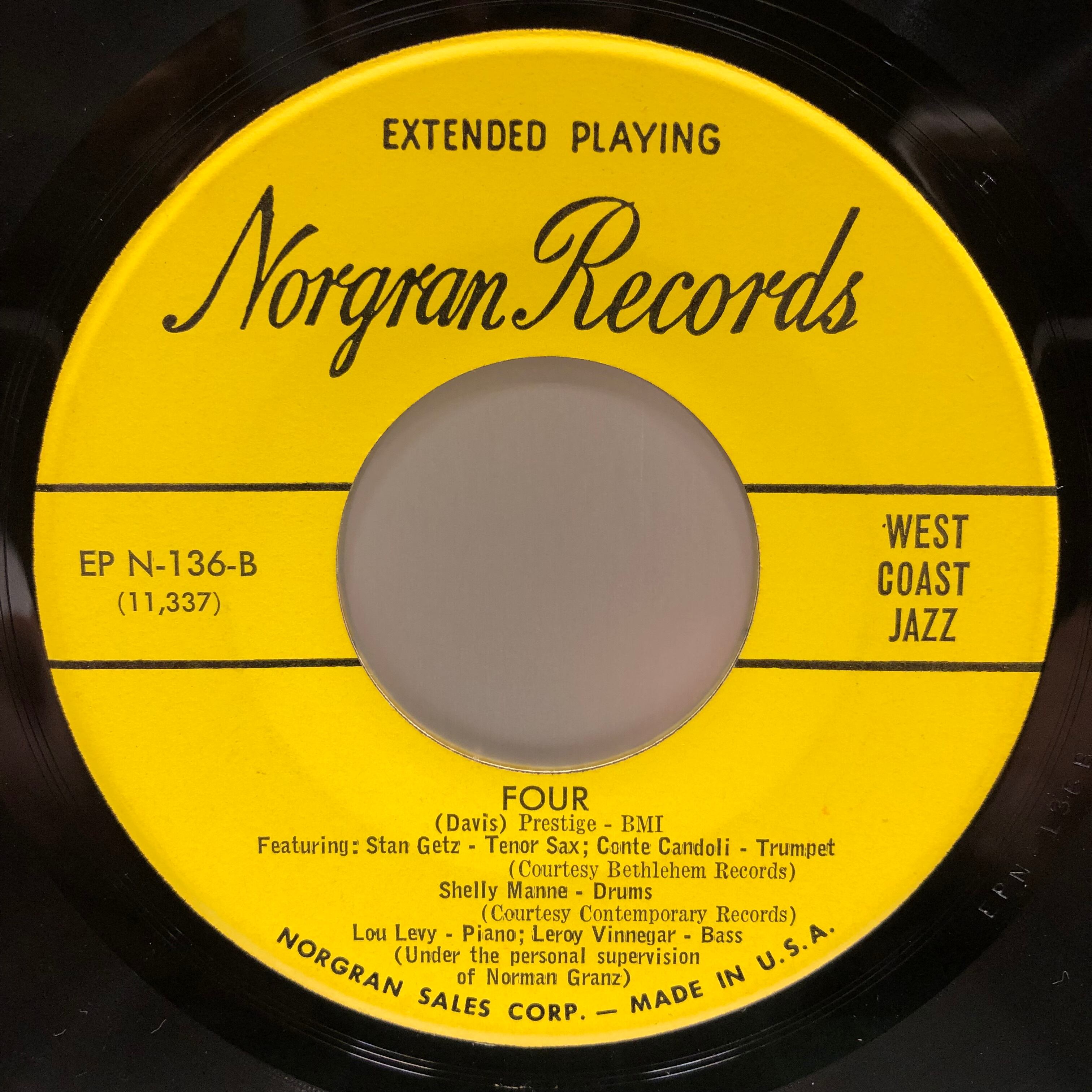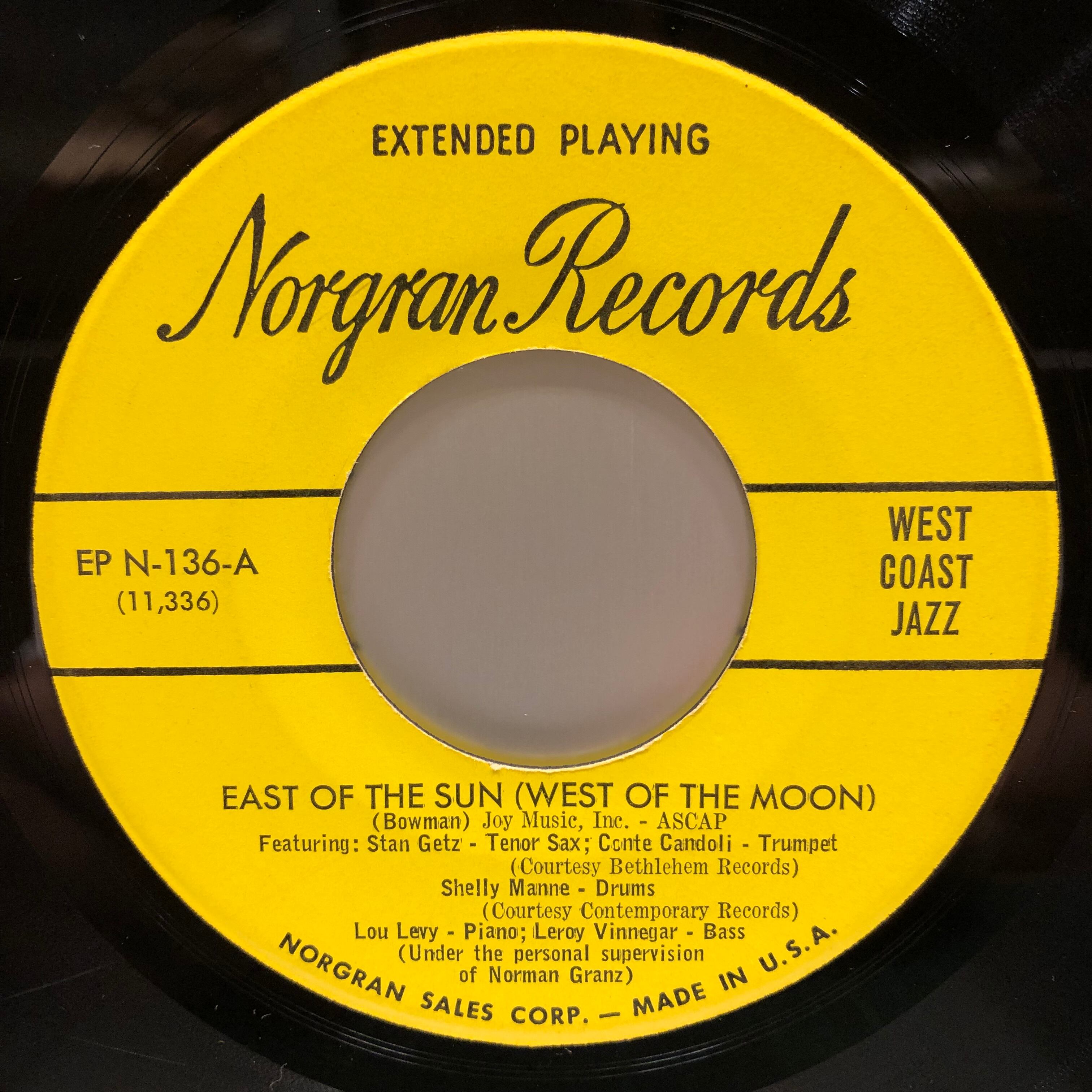 ’55年ハリウッド録音アルバム「West Cost Jazz」冒頭を飾った"East Of The Sun"をA面に、マイルス作品"Four"をB面に収録したヴァーヴ前身ノーグランオリジナルシングル。